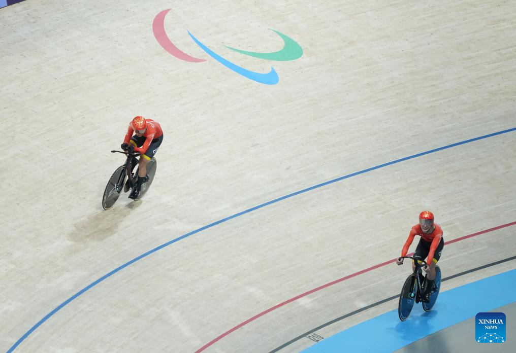 Li Zhangyu (L) and Liang Weicong of China compete during the men's C1 3000m individual pursuit final of para cycling track at the Paris 2024 Paralympic Games in Paris, France, Aug. 29, 2024. (Xinhua/He Canling)