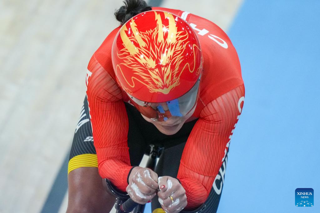 Wang Xiaomei of China competes during the women's C1-3 3000m individual pursuit final of para cycling track at the Paris 2024 Paralympic Games in Paris, France, Aug. 29, 2024. (Xinhua/Huang Wei)