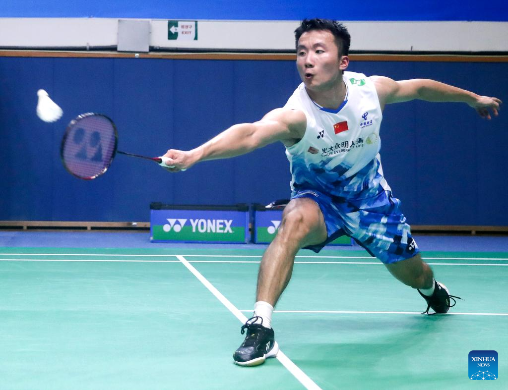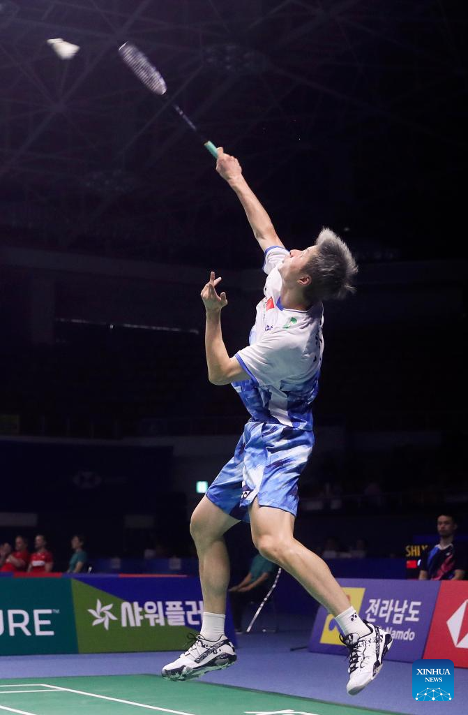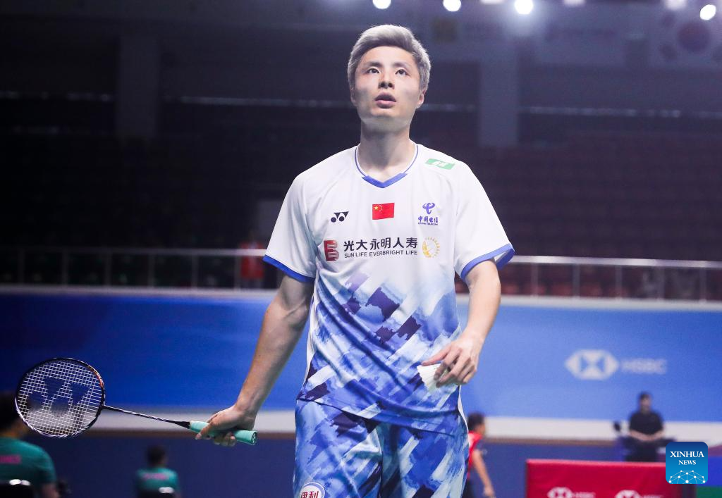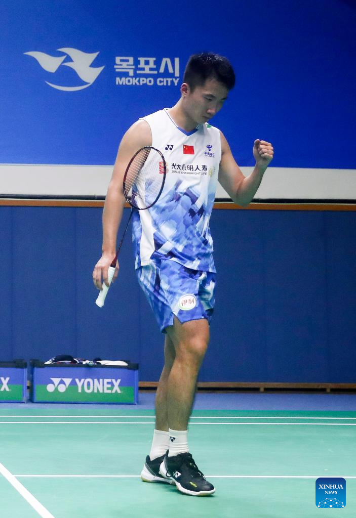 Shi Yuqi of China competes during the men's singles quarterfinal match against Lee Cheuk Yiu of China's Hongkong at the BWF Korea Open Badminton Championships 2024 in Mokpo, South Korea, Aug. 30, 2024. (Xinhua/Yao Qilin)