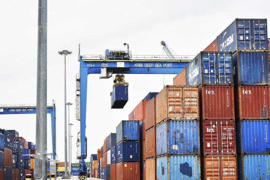 This file photo taken on March 15, 2022 shows cargo containers stored at Kribi Deep Seaport, Kribi, Cameroon. (Photo by Kepseu/Xinhua)