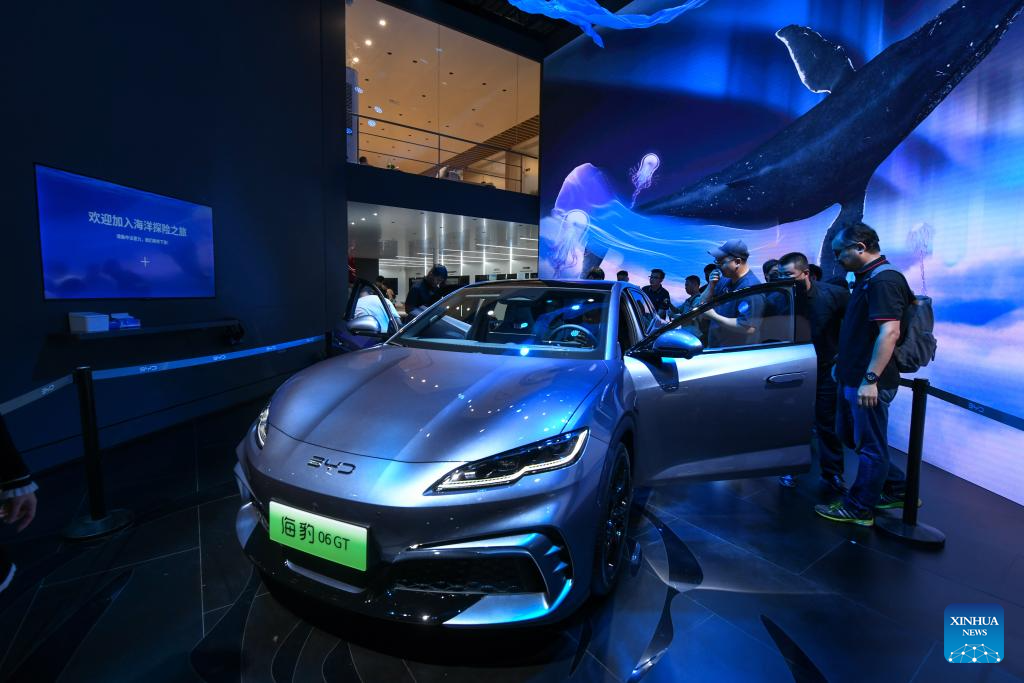 A BYD Seal 06GT electric car is on display during Chengdu Motor Show 2024 in Chengdu, southwest China's Sichuan Province, Aug. 30, 2024. The Chengdu Motor Show 2024 kicked off here on Friday. Nearly 130 Chinese and foreign car companies made appearance during the motor show, with more than 1,600 vehicles on display. (Xinhua/Tang Wenhao)