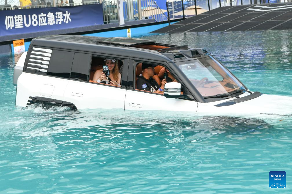 A Yangwang U8 SUV goes through emergency floating test during Chengdu Motor Show 2024 in Chengdu, southwest China's Sichuan Province, Aug. 30, 2024. The Chengdu Motor Show 2024 kicked off here on Friday. Nearly 130 Chinese and foreign car companies made appearance during the motor show, with more than 1,600 vehicles on display. (Xinhua/Tang Wenhao)