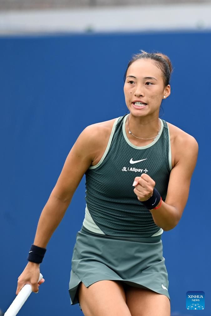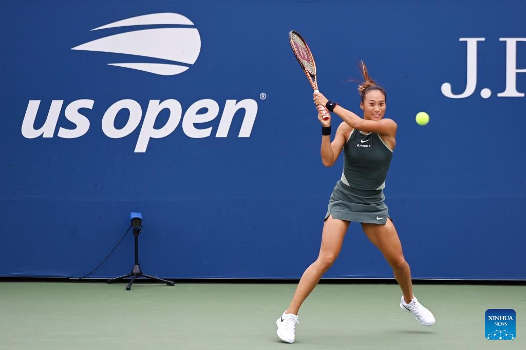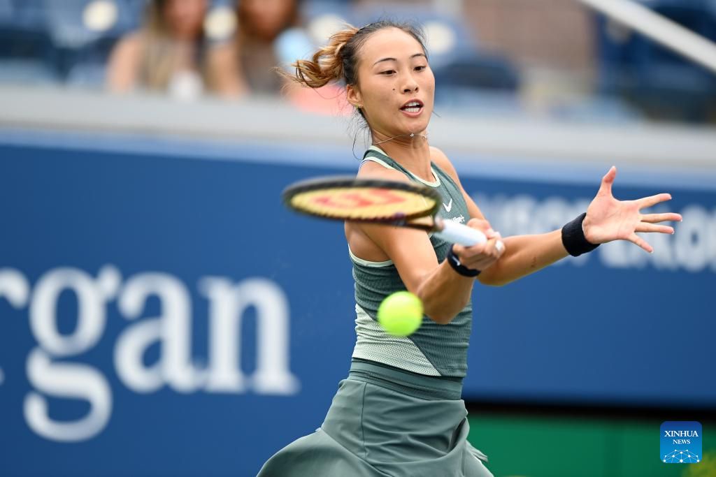 Zheng Qinwen of China competes during the women's singles third round match between Zheng Qinwen of China and Jule Niemeier of Germany at the 2024 US Open tennis championships in New York, the United States, on Aug. 30, 2024. (Xinhua/Li Rui)