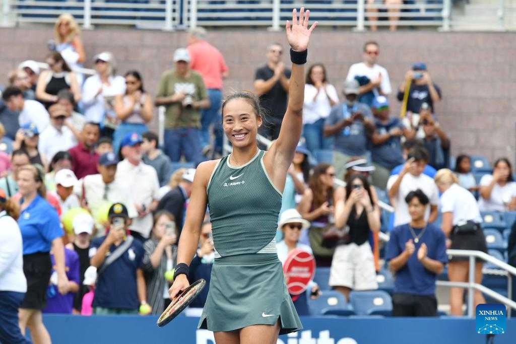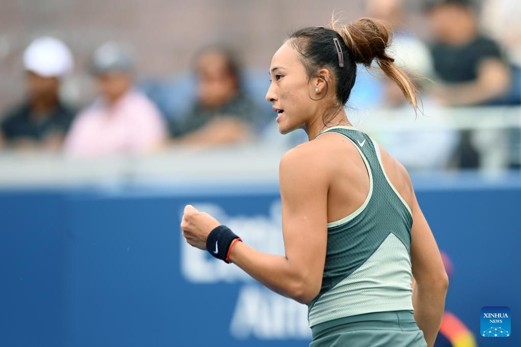 Zheng Qinwen of China celebrates after the women's singles third round match between Zheng Qinwen of China and Jule Niemeier of Germany at the 2024 US Open tennis championships in New York, the United States, on Aug. 30, 2024. (Xinhua/Li Rui)