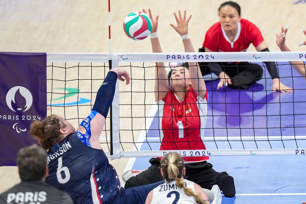 Tang Xuemei (No.1) of China defends against Heather Nicole Erickson of the United States during the sitting volleyball women's preliminaries Pool A match between China and the United States at the Paris 2024 Paralympic Games in Paris, Aug. 30, 2024. (Xinhua/Zhang Cheng)