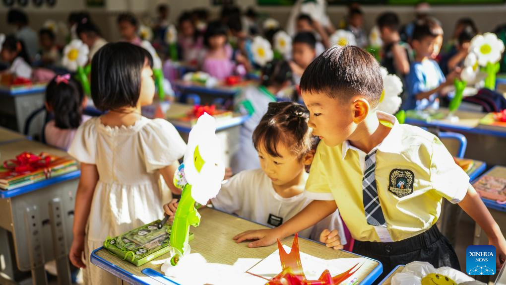Students observe the growth of plants at a greenhouse of a primary school in Boxing County, east China's Shandong Province, Sept. 1, 2024. Schools across China hosted activities to mark the start of the new semester on Sunday. (Photo by Chen Bin/Xinhua)