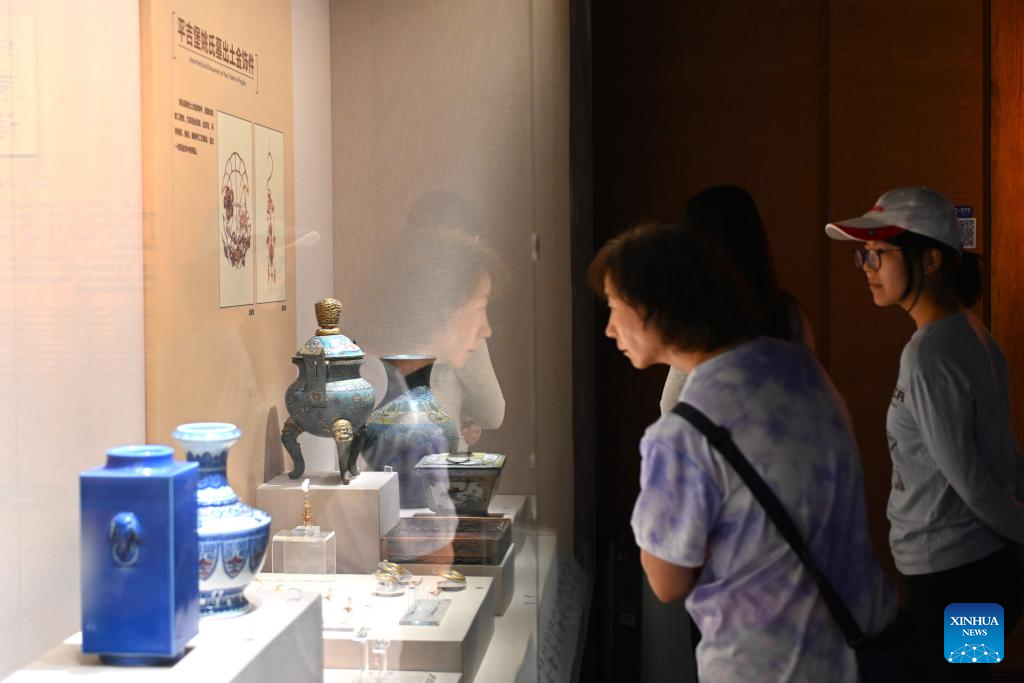 Tourists look at cultural relics in Ningxia Museum in Yinchuan, capital of northwest China's Ningxia Hui Autonomous Region, Sept. 1, 2024. As one of China's national first-grade museums, Ningxia Museum showcases the rich culture and history of Ningxia. (Xinhua/Mao Zhu)