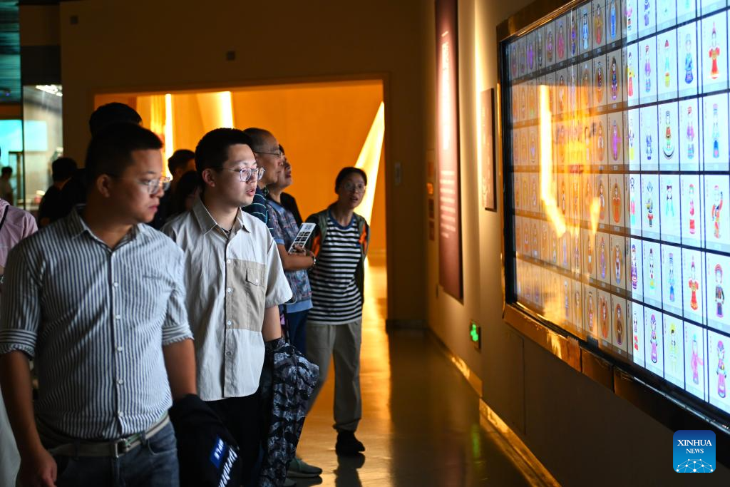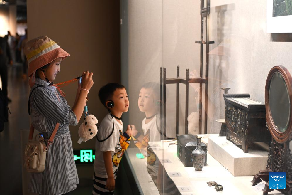 Tourists look at cultural relics of Xixia Dynasty (1038-1227), in Ningxia Museum in Yinchuan, capital of northwest China's Ningxia Hui Autonomous Region, Sept. 1, 2024. As one of China's national first-grade museums, Ningxia Museum showcases the rich culture and history of Ningxia. (Xinhua/Mao Zhu)