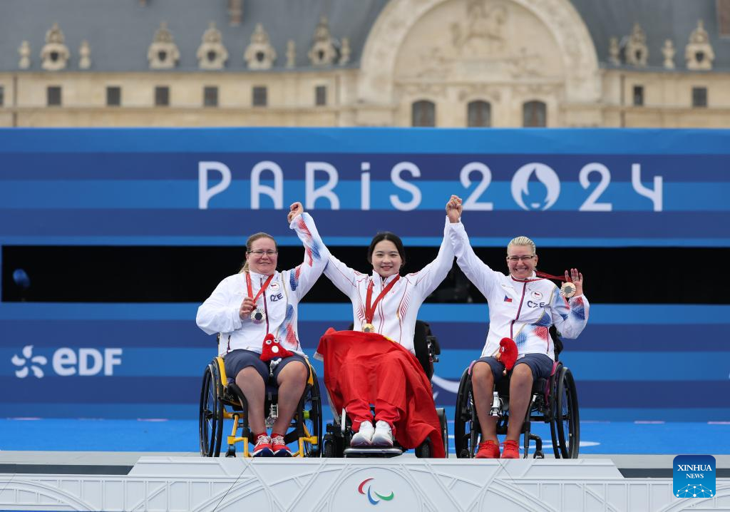 Gold medalist Chen Minyi (C) of China, silver medalist Sarka Pultar Musilova (L) of the Czech Republic and bronze medalist Tereza Brandtlova of the Czech Republic celebrate during the awarding ceremony for the women's individual W1 event of para archery at the Paris 2024 Paralympic Games in Paris, France, Aug. 31, 2024. (Xinhua/Hou Jun)