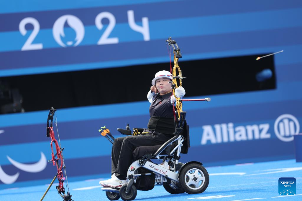 Chen Minyi of China competes during the para archery women's individual W1 gold medal match against Sarka Pultar Musilova of the Czech Republic at the Paris 2024 Paralympic Games in Paris, France, Aug. 31, 2024. (Xinhua/Hou Jun)