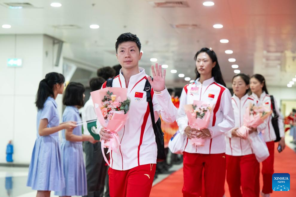 Chinese table tennis player Ma Long (front) gestures during the welcome ceremony after arriving in Macao, south China, Aug. 31, 2024. A delegation of Chinese mainland Olympians from the Paris 2024 Olympic Games arrived in Macao on Saturday for a three-day visit. (Xinhua/Cheong Kam Ka)