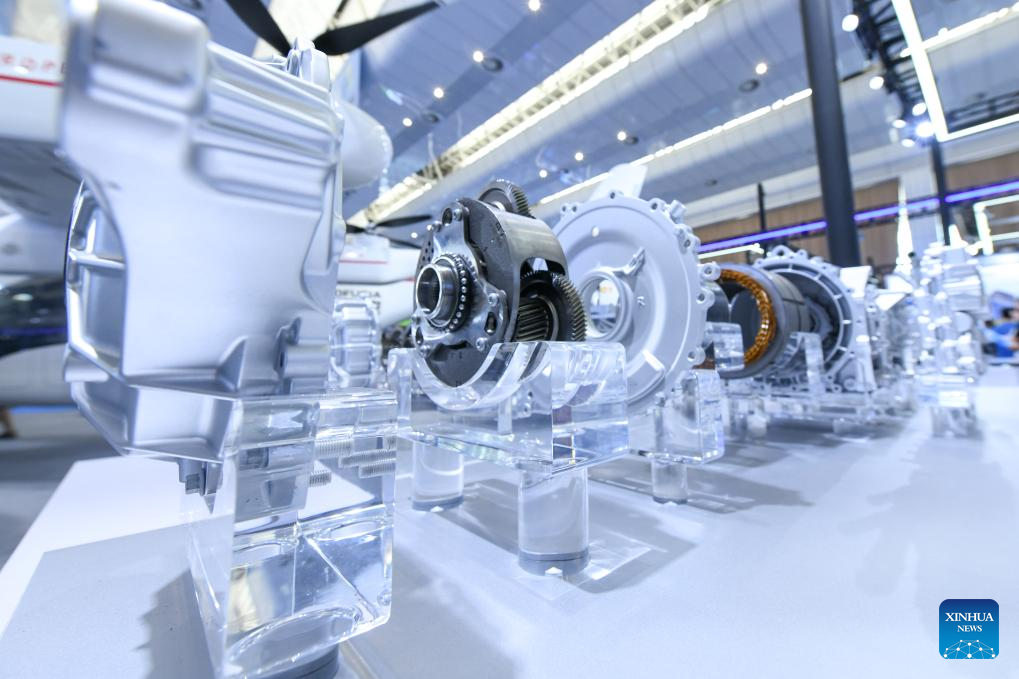 Visitors learn about a 800V dual-motor drive system for the new energy vehicle (NEV) at an exhibition on the sidelines of the 2024 World Power Battery Conference in Yibin, southwest China's Sichuan Province, Sept. 1, 2024.(Xinhua/Tang Wenhao)