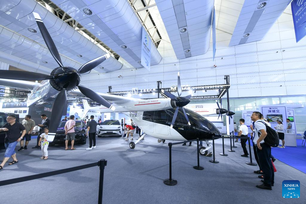 Visitors look at an electric vertical take-off and landing aircraft in Yibin, southwest China's Sichuan Province, Sept. 2, 2024.(Xinhua/Tang Wenhao)