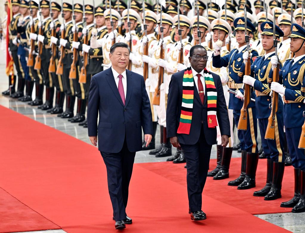 Chinese President Xi Jinping holds a welcoming ceremony for Zimbabwean President Emmerson Mnangagwa, who is in Beijing for the 2024 Summit of the Forum on China-Africa Cooperation (FOCAC) and a state visit, in the Northern Hall of the Great Hall of the People prior to their talks in Beijing, capital of China, Sept. 3, 2024. Xi held talks with Mnangagwa at the Great Hall of the People in Beijing on Tuesday. (Xinhua/Zhai Jianlan)
