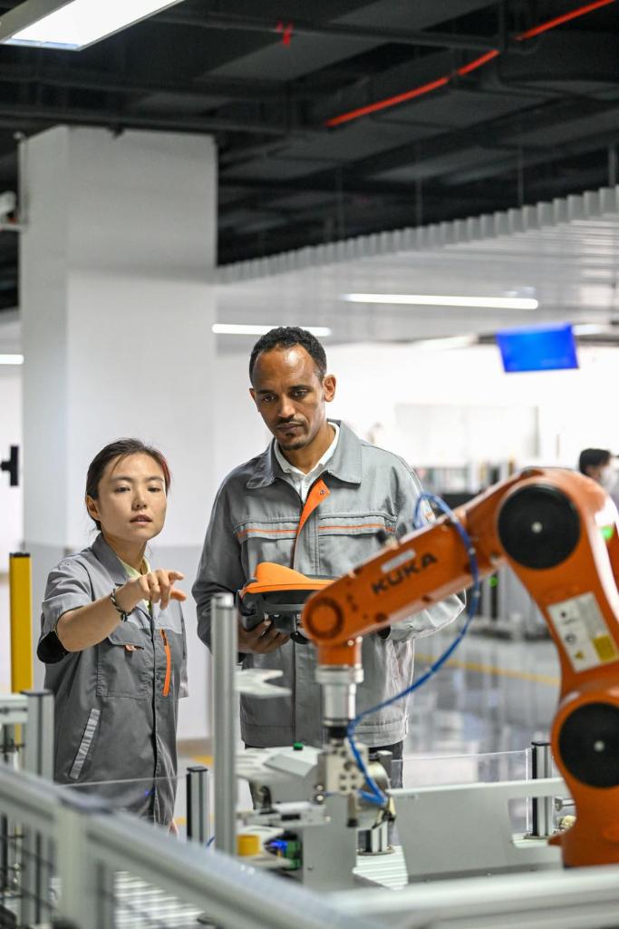 Tola Tsegaye Alemu (R) operates an industrial robot under the guidance of a teacher in Tianjin University of Technology and Education in north China's Tianjin, on June 27, 2024. (Xinhua/Sun Fanyue)