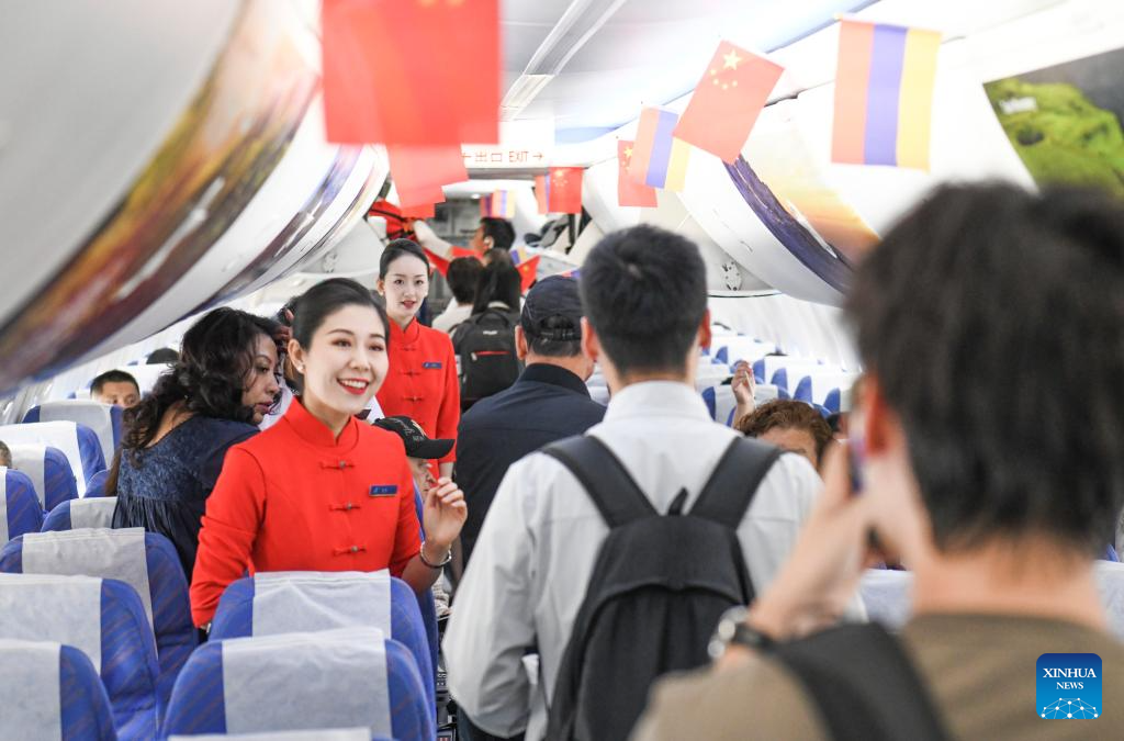 URUMQI, Sept. 3 (Xinhua) -- A direct air route connecting Urumqi, the capital of northwest China's Xinjiang Uygur Autonomous Region, with Yerevan, the capital of Armenia, was inaugurated on Tuesday. This marks China's first direct flight to Armenia, a country increasingly recognized as a popular travel destination.
