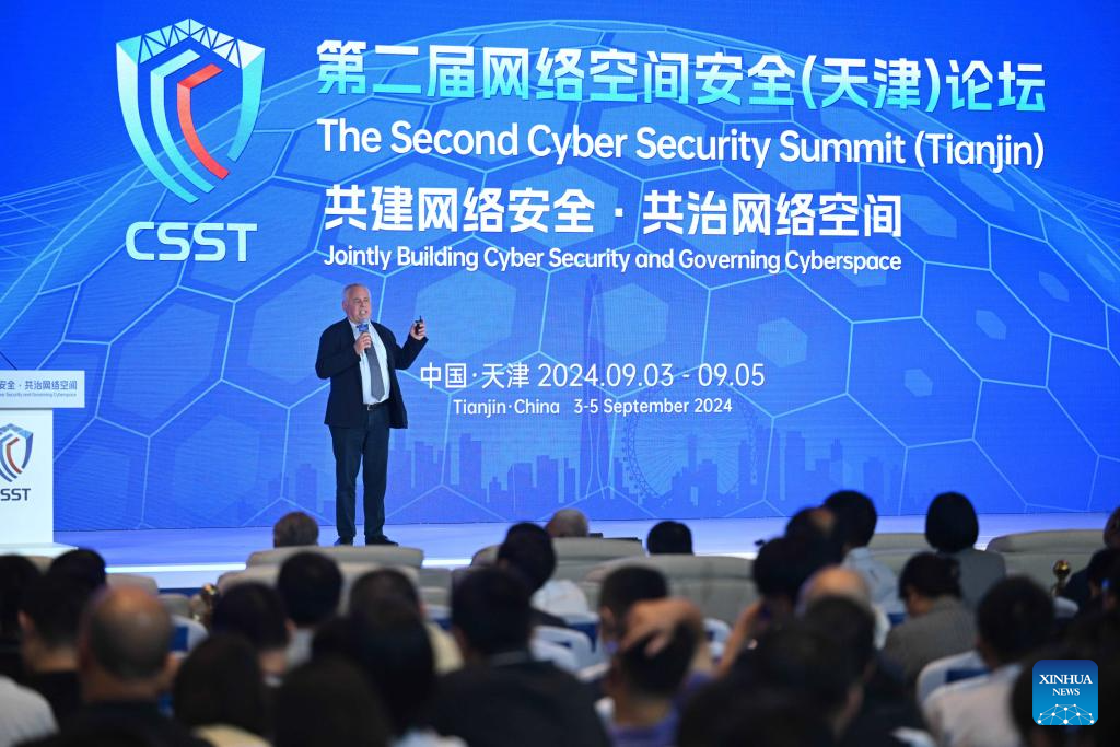 This photo shows the second Cyber Security Summit (Tianjin) (CSST) in north China's Tianjin municipality, Sept. 4, 2024. The second CSST is held here under the theme "Jointly Building Cyber Security and Governing Cyberspace." (Xinhua/Sun Fanyue)
