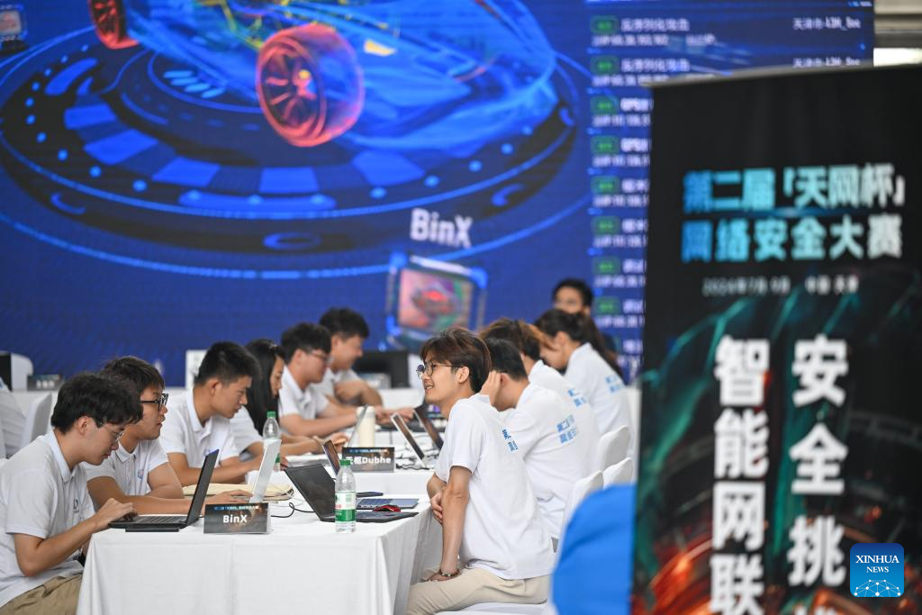 Participants attend a cyber security contest during the second Cyber Security Summit (Tianjin) (CSST) in north China's Tianjin municipality, Sept. 4, 2024. The second CSST is held here under the theme "Jointly Building Cyber Security and Governing Cyberspace." (Xinhua/Sun Fanyue)