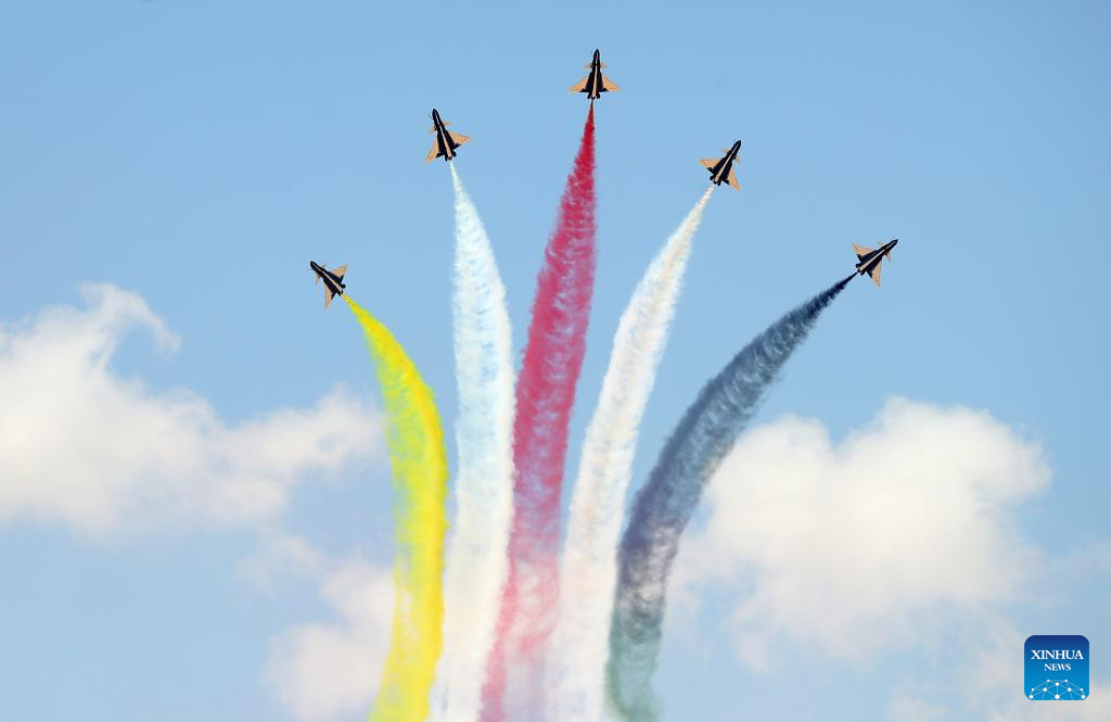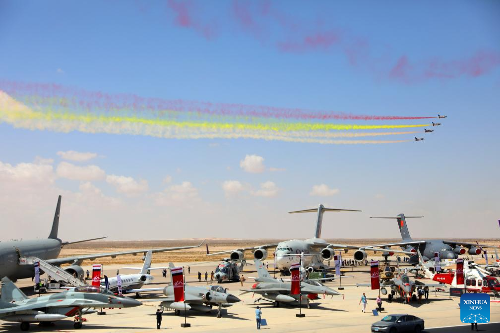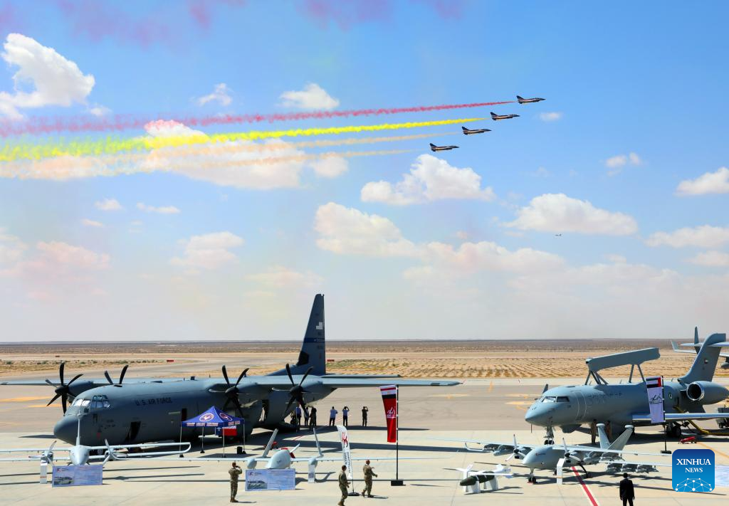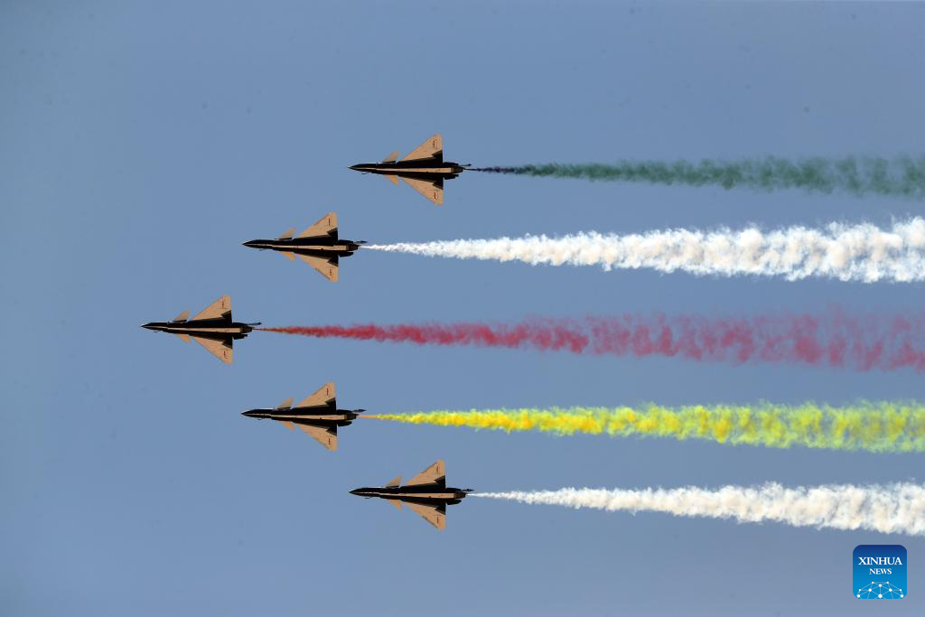 The Chinese People's Liberation Army (PLA) Air Force's August 1st aerobatics team performs during the first edition of the Egypt International Airshow at El Alamein International Airport in El Dabaa, Egypt, Sept. 4, 2024. The first edition of the Egypt International Airshow kicked off on Tuesday at a northern airport in the country, with flight performances by air forces from Egypt, China, and other countries. (Xinhua/Wang Dongzhen)