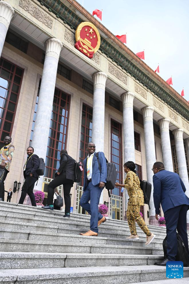 Journalists enter the Great Hall of the People before the opening of the 2024 Summit of the Forum on China-Africa Cooperation (FOCAC) in Beijing, capital of China, Sept. 5, 2024. The 2024 Summit of the Forum on China-Africa Cooperation (FOCAC) opened here on Thursday. (Xinhua/Jin Liangkuai)