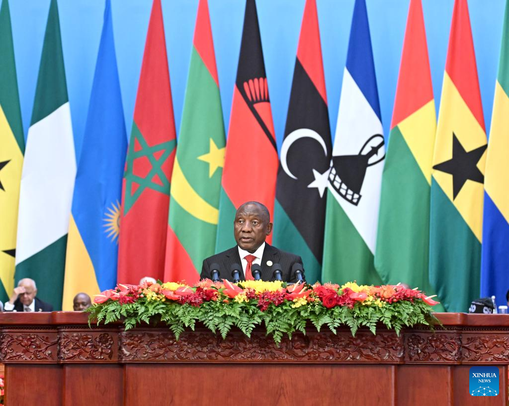 South African President Cyril Ramaphosa addresses the opening ceremony of the 2024 Summit of the Forum on China-Africa Cooperation (FOCAC) at the Great Hall of the People in Beijing, capital of China, Sept. 5, 2024. The 2024 Summit of the FOCAC opened here on Thursday. (Xinhua/Yan Yan)