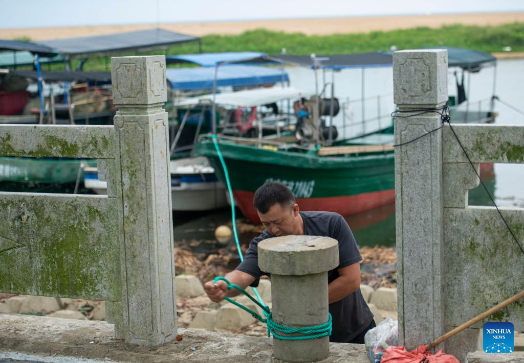 A fisherman fastens a fishing boat in Boao township of Qionghai, south China's Hainan Province, Sept. 5, 2024. The State Flood Control and Drought Relief Headquarters raised its emergency response for flood and typhoon prevention from level III to level II in Guangdong and Hainan provinces at 3 p.m. Thursday, as typhoon Yagi approaches.
