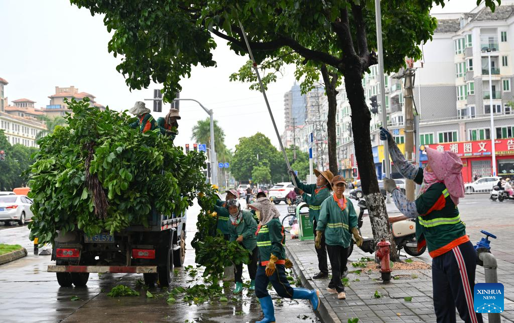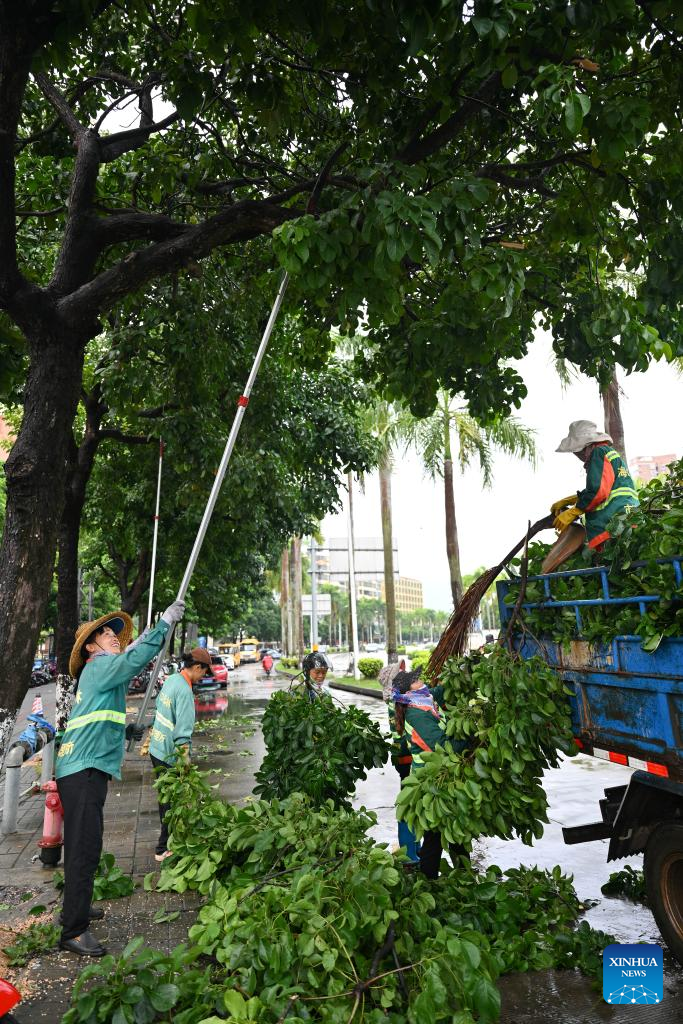Workers cut redundant branches of trees ahead of the landfall of typhoon Yagi in Haikou, south China's Hainan Province, Sept. 5, 2024. The State Flood Control and Drought Relief Headquarters raised its emergency response for flood and typhoon prevention from level III to level II in Guangdong and Hainan provinces at 3 p.m. Thursday, as typhoon Yagi approaches.