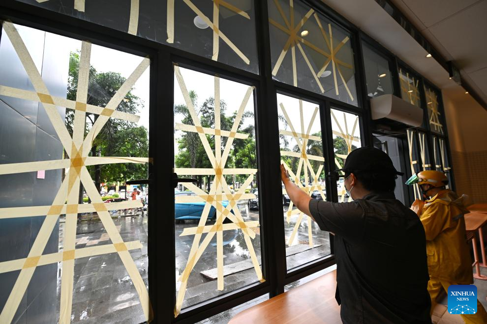 A staff member of a cafe reinforces a glass window in Haikou, south China's Hainan Province, Sept. 5, 2024. The State Flood Control and Drought Relief Headquarters raised its emergency response for flood and typhoon prevention from level III to level II in Guangdong and Hainan provinces at 3 p.m. Thursday, as typhoon Yagi approaches.