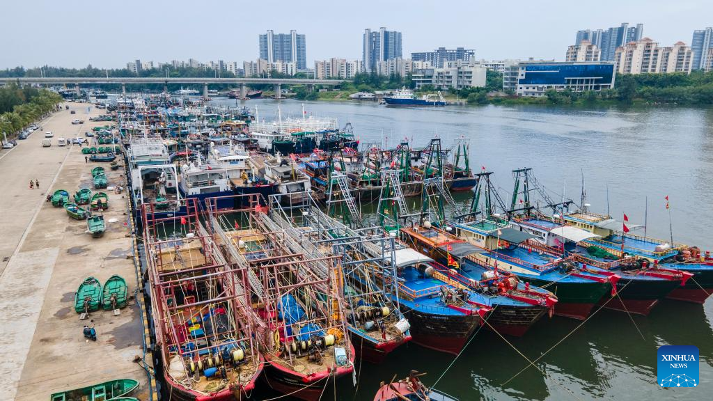 An aerial drone photo taken on Sept. 5, 2024 shows fishing ships docking at Tanmen port in Qionghai, south China's Hainan Province. The State Flood Control and Drought Relief Headquarters raised its emergency response for flood and typhoon prevention from level III to level II in Guangdong and Hainan provinces at 3 p.m. Thursday, as typhoon Yagi approaches.