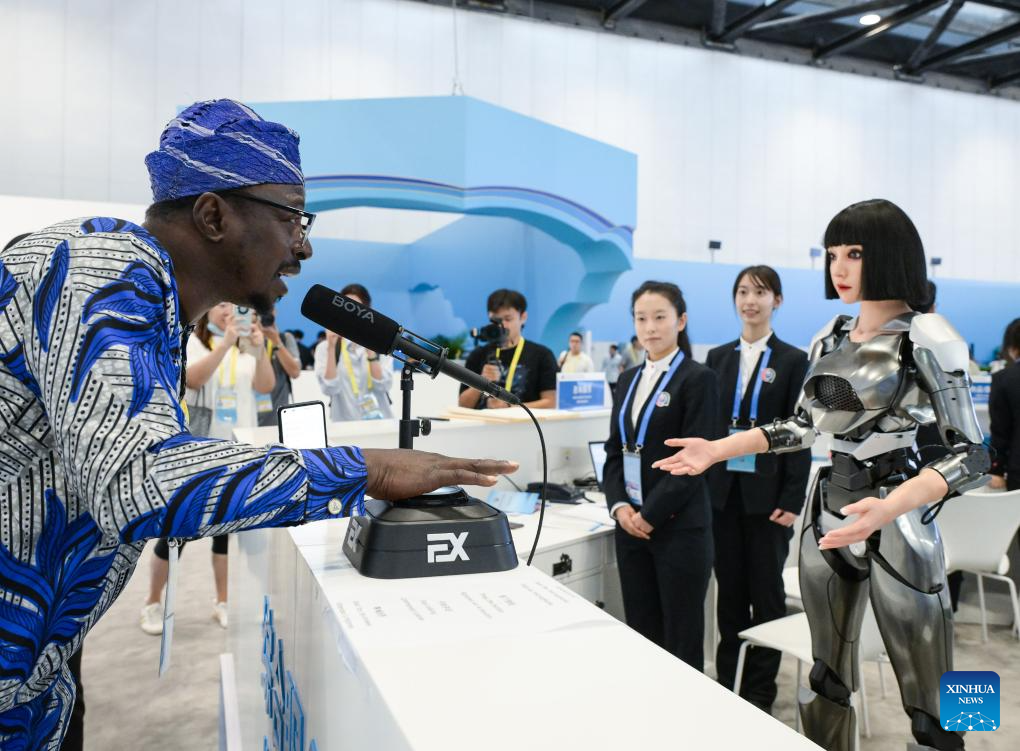 An African journalist interacts with a robot at the media center for the 2024 Summit of the Forum on China-Africa Cooperation (FOCAC) in Beijing, capital of China, Sept. 3, 2024. (Xinhua/Li He)