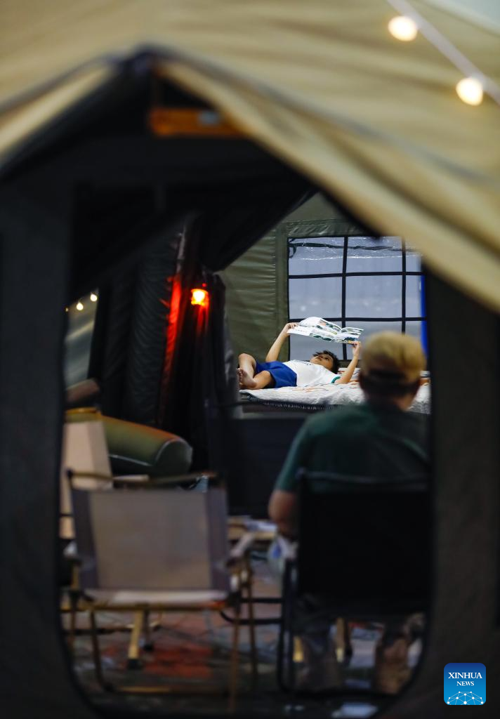 Visitors experience a tent at China Camping Life Expo in Chengdu, southwest China's Sichuan Province, Sept. 6, 2024. The three-day expo kicked off on Friday, showcasing outdoor products from nearly a hundred outdoor brands. (Xinhua/Shen Bohan)