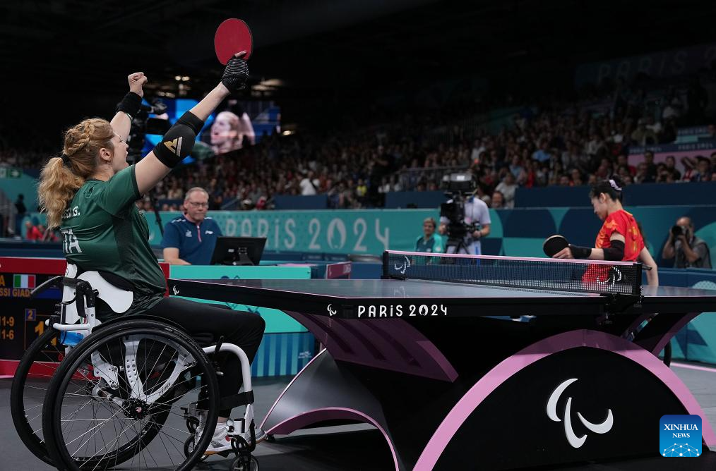 Giada Rossi of Italy celebrates after winning the Para Table Tennis women's singles WS1-2 final match against Liu Jing of China at the Paris 2024 Paralympic Games in Paris, France, Sept. 6, 2024. (Xinhua/Hou Zhaokang)