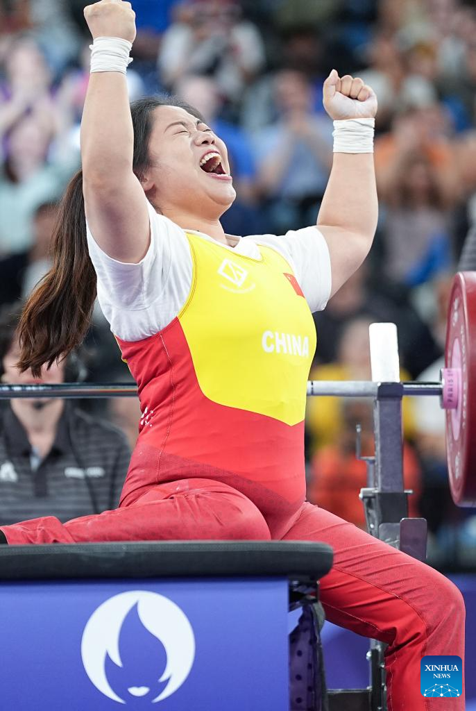 Tan Yujiao of China celebrates during the para powerlifting women's up to 67kg final at the Paris 2024 Paralympic Games in Paris, France, Sept. 6, 2024. (Xinhua/Lian Yi)