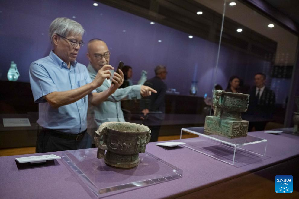 People visit an exhibition "The Splendor of Chinese Bronzes: Masterpieces from the National Museum of China" at Macao Museum of Art in Macao, south China, Sept. 6, 2024. The exhibition kicked off on Friday in Macao, showcasing more than 150 ancient bronzes from the collection of the National Museum of China. (Xinhua/Cheong Kam Ka)