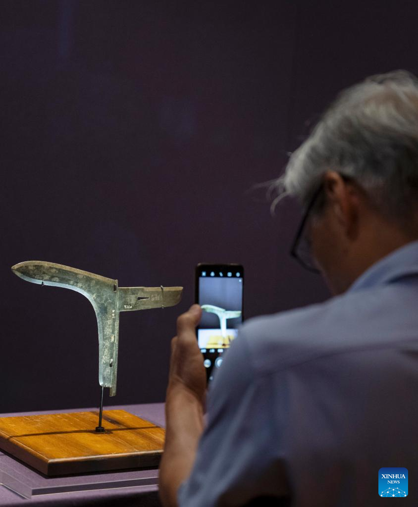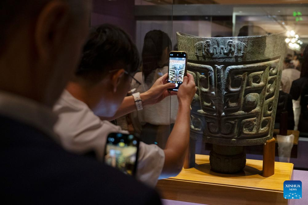 A visitor takes photos at an exhibition "The Splendor of Chinese Bronzes: Masterpieces from the National Museum of China" at Macao Museum of Art in Macao, south China, Sept. 6, 2024. The exhibition kicked off on Friday in Macao, showcasing more than 150 ancient bronzes from the collection of the National Museum of China. (Xinhua/Cheong Kam Ka)