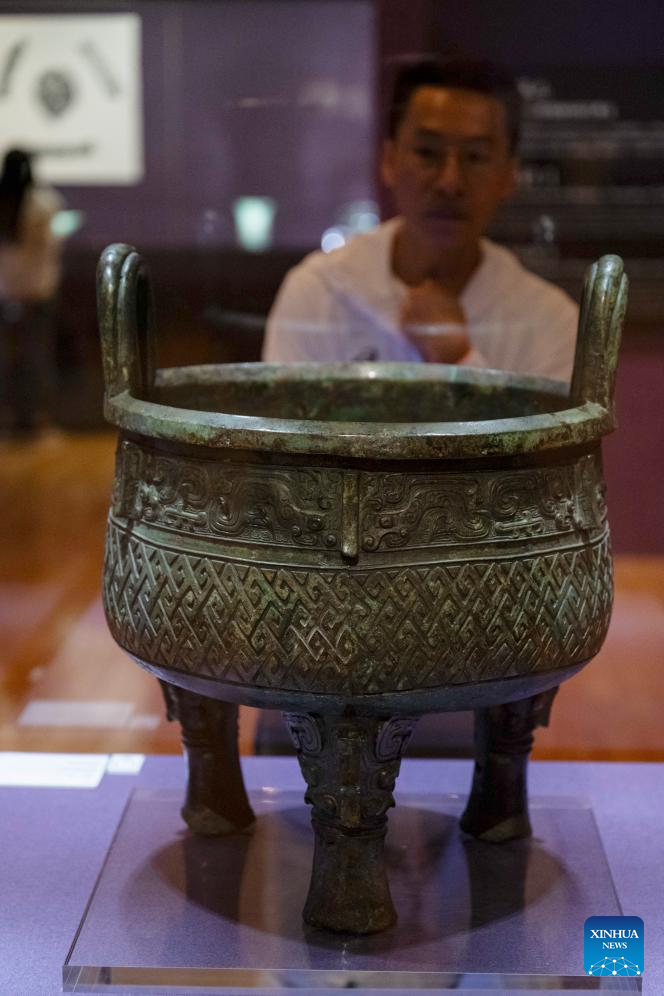 A visitor looks at an exhibit at an exhibition "The Splendor of Chinese Bronzes: Masterpieces from the National Museum of China" at Macao Museum of Art in Macao, south China, Sept. 6, 2024. The exhibition kicked off on Friday in Macao, showcasing more than 150 ancient bronzes from the collection of the National Museum of China. (Xinhua/Cheong Kam Ka)
