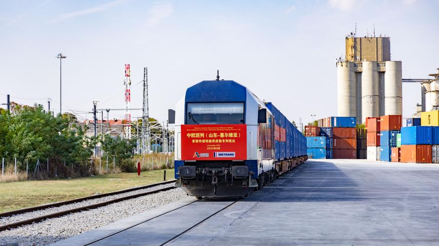 The first specialized supply chain train for China's Shandong Linglong Tyre Co., Ltd., of China-Europe Express Railway arrives in Indjija, Belgrade, Sept, 7, 2024. (Photo by Wang Wei/Xinhua)