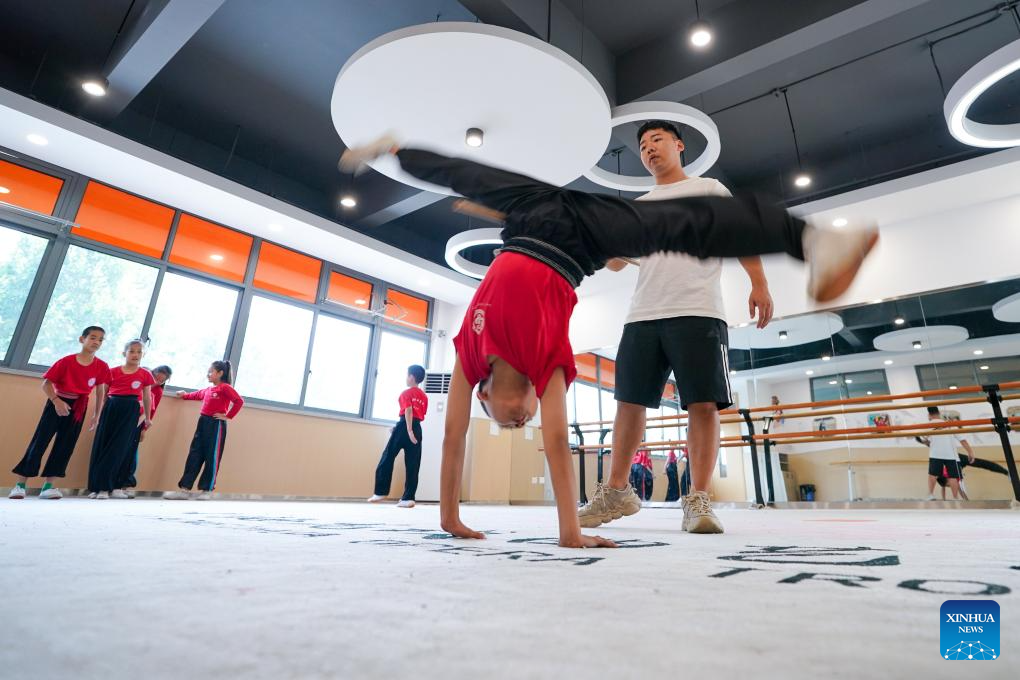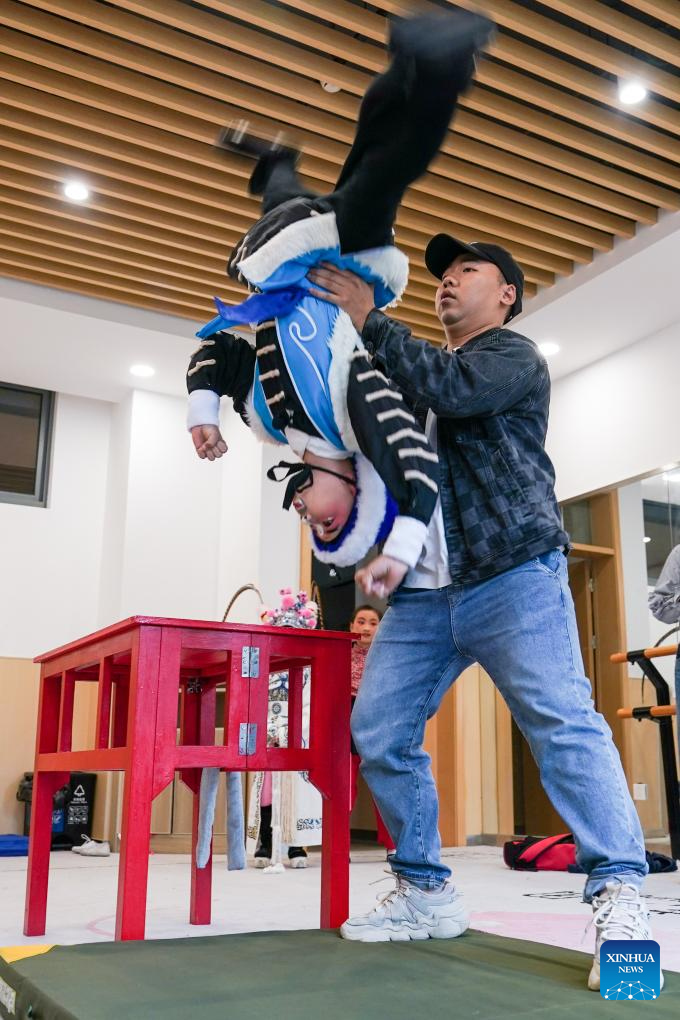 Zhou Jie, a full-time teacher of the "little Kunqu Opera training class," guides a pupil at a training room of Shipai Center Primary School of Kunshan in Kunshan City, east China's Jiangsu Province, Sept. 6, 2024. Born in 1995 and raised up in Kunshan City of east China's Jiangsu Province, Zhou Jie's childhood memories were filled with Kunqu Opera on every festivals and celebrations. (Xinhua/Li Bo)