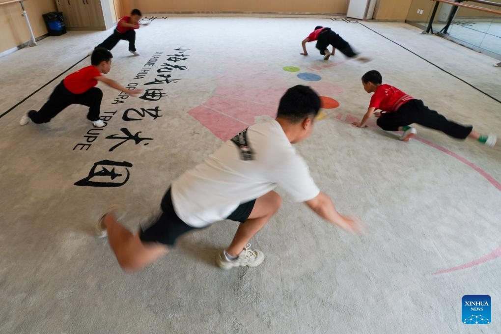 Zhou Jie, a full-time teacher of the "little Kunqu Opera training class," guides pupils at a training room of Shipai Center Primary School of Kunshan in Kunshan City, east China's Jiangsu Province, Sept. 6, 2024. (Xinhua/Li Bo)