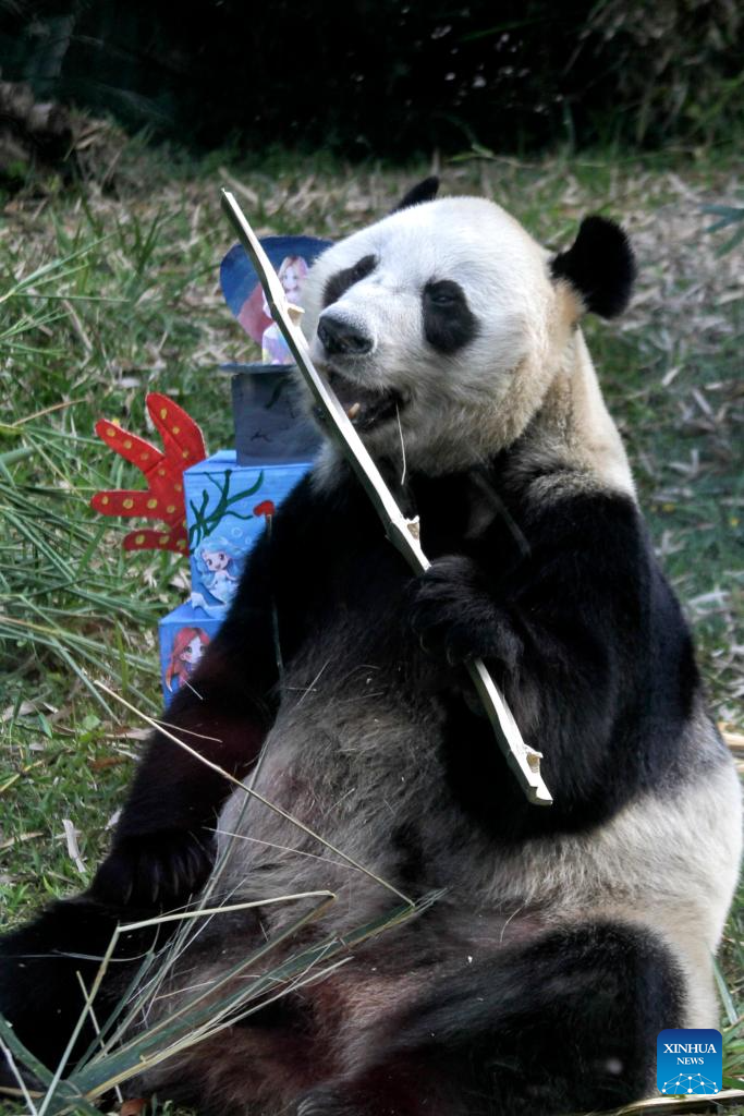 The female giant panda Hu Chun eats bamboo during a celebration for her 14th birthday at Taman Safari zoo park in Bogor, West Java, Indonesia, Sept. 7, 2024. Hu Chun from southwest China's Sichuan Province has been living in the park since 2017. (Photo by Sandika Fadilah/Xinhua)