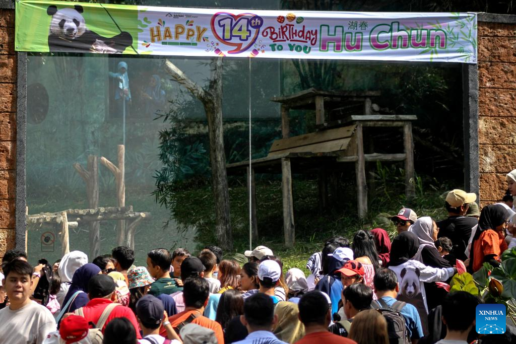 People look at the female giant panda Hu Chun during a celebration for her 14th birthday at Taman Safari zoo park in Bogor, West Java, Indonesia, Sept. 7, 2024. Hu Chun from southwest China's Sichuan Province has been living in the park since 2017. (Photo by Sandika Fadilah/Xinhua)