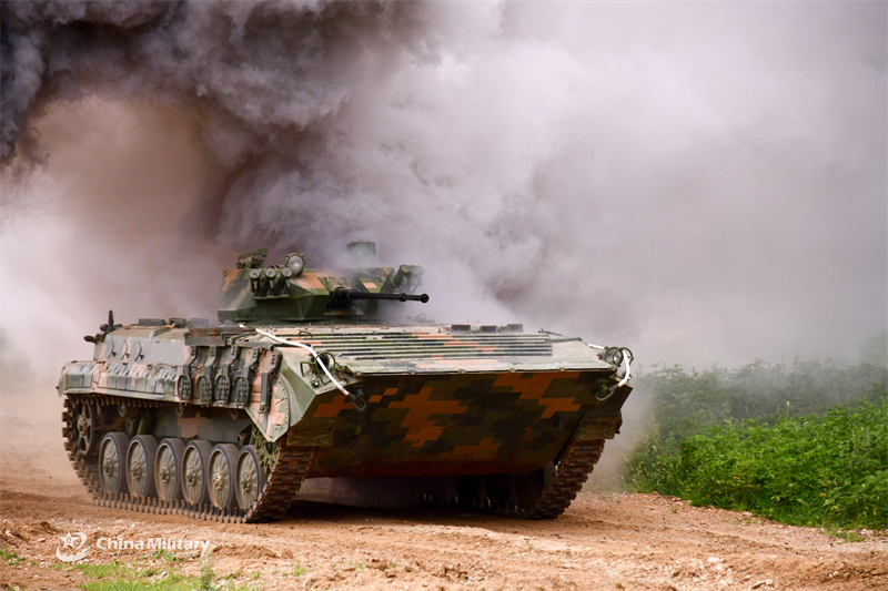 An armored vehicle attached to a brigade under the Chinese PLA 79th Group Army passes through the mock enemy's artillery barrage during a company-level tactic assessment in late July 2024. (eng.chinamil.com.cn/Photo by Wang Lijun)