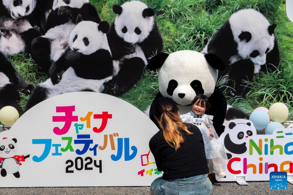 A woman takes a picture of her child with a giant panda doll during China Festival 2024 at Yoyogi Park in Tokyo, Japan, Sept. 7, 2024. China Festival 2024 kicked off in Yoyogi Park in downtown Tokyo on Saturday to promote people-to-people exchanges between China and Japan. (Xinhua/Zhang Xiaoyu)