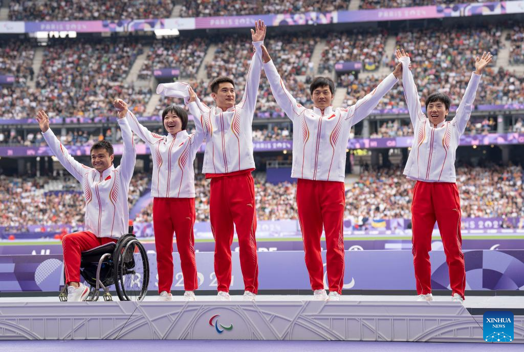 Gold medalists Hu Yang, Wen Xiaoyan, Wang Hao, Jia Dengpu and Zhou Guohua (L-R) of team China celebrate on the podium during the awarding ceremony for the 4x100m Universal Relay final of Para Athletics at the Paris 2024 Paralympic Games in Paris, France, Sept. 7, 2024. (Xinhua/Cai Yang)