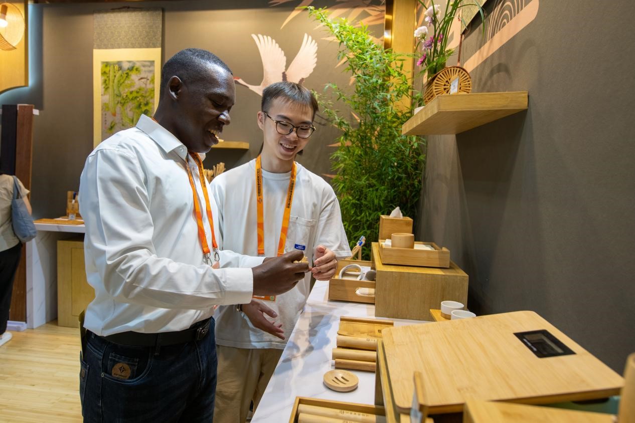 Photo shows environmentally friendly bamboo products exhibited at the comprehensive exhibition of the 2023 China International Fair for Trade in Services (CIFTIS), September 4, 2023. (People's Daily Online/Weng Qiyu)