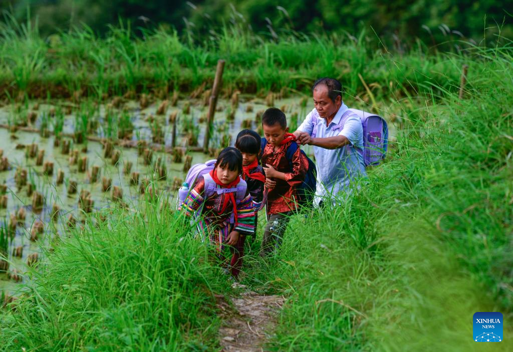 Meng Rongda accompanies students after school on their way home in Xishan Township of Congjiang County, southwest China's Guizhou Province, Sept. 5, 2024. (Xinhua/Yang Wenbin)