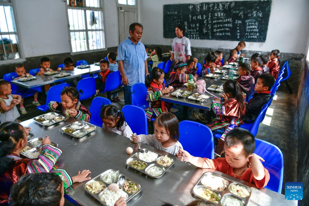 Students have lunch at Zhongzhai teaching site in Xishan Township of Congjiang County, southwest China's Guizhou Province, Sept. 6, 2024. (Xinhua/Yang Wenbin)