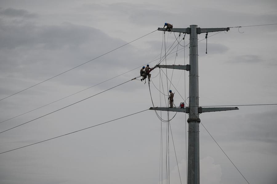 Staff members from a local power company repair electrical facilities in Chengmai County, south China's Hainan Province, Sept. 9, 2024. (Xinhua/Pu Xiaoxu)