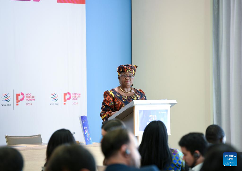 WTO Director-General Ngozi Okonjo-Iweala (at the podium) speaks at the WTO Public Forum 2024 in Geneva, Switzerland, on Sept. 10, 2024. The World Trade Organization (WTO) Public Forum 2024 opened in Geneva on Tuesday, highlighting the theme "Re-globalization: better trade for a better world." (Xinhua/Lian Yi)