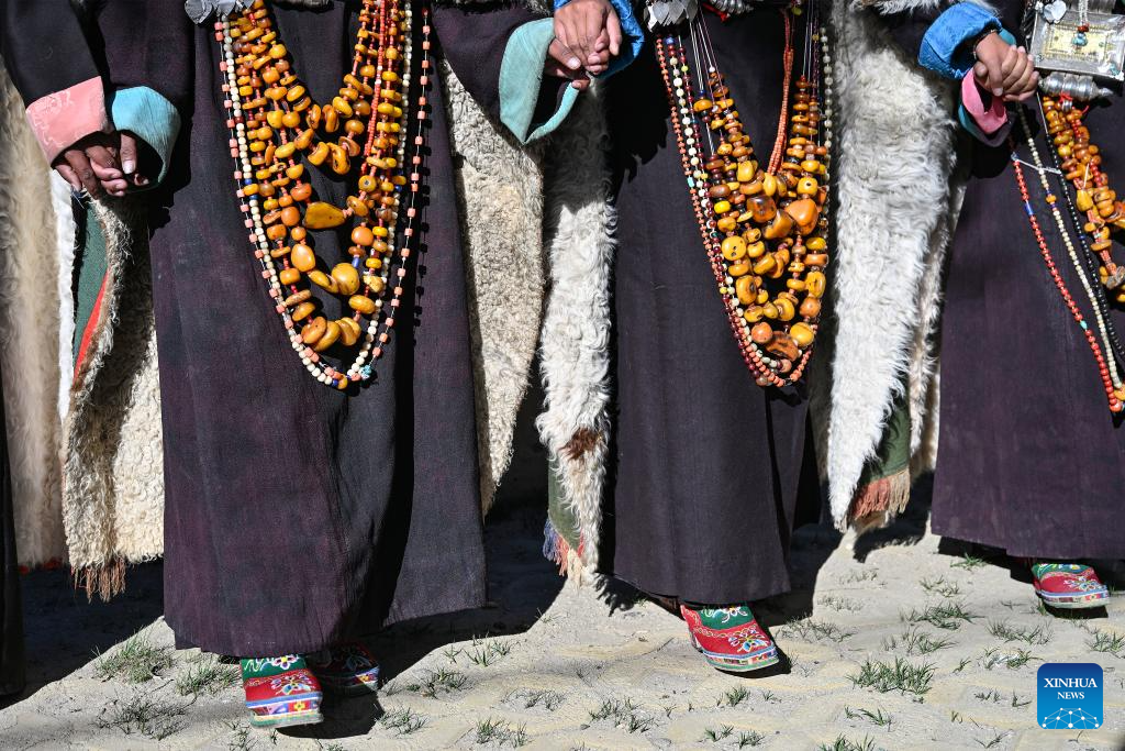 Villagers dressed in folk costume dance in Kejia Village of Pulan County, southwest China's Xizang Autonomous Region, Sept. 9, 2024. Originating in Pulan County, Pulan folk costume has been a traditional garment worn at celebrations for over a millennium. Weighing more than 20 kilograms, a piece of this unique costume is usually decorated with rare metals and jewels, like gold, silver, beeswax, coral and turquoise. (Xinhua/Sun Ruibo)